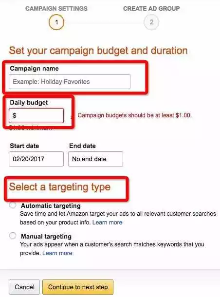 2. 進入廣告管理界面,按照圖片的提示分別填入Campaign name、Daily budget、Start date,以及End date,設(shè)置自動選擇關(guān)鍵詞還是手動選擇關(guān)鍵詞。