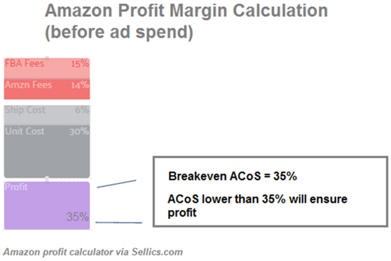 在上圖例子中,賣家利潤率為35%,這也是賣家盈虧平衡時的ACOS。只要賣家在PPC產(chǎn)品廣告上的開支不超過35%,就不會有損失。運行廣告的目標就是為了盈利,因此賣家需要為每件產(chǎn)品制定凈利潤率,以控制廣告成本。這就是賣家需要確定目標ACOS的原因。