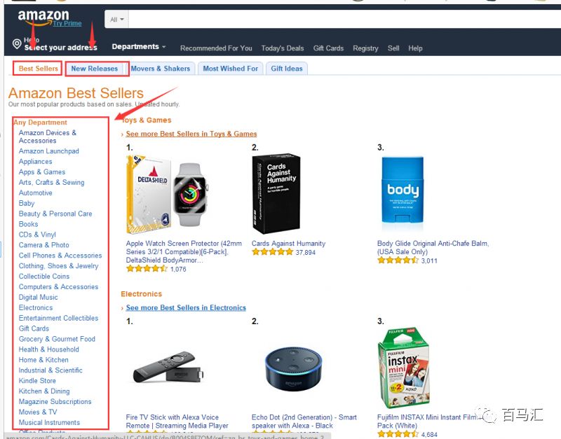 在選品的過程中,數(shù)據(jù)分析非常重要的一個環(huán)節(jié),首先進(jìn)去亞馬遜的榜單:https://www.amazon.com/Best-Sellers/zgbs,我們主要是通過best sellers和new releases這兩個榜單進(jìn)行數(shù)據(jù)分析,賣家通過左側(cè)框中選擇自己感興趣的類目。