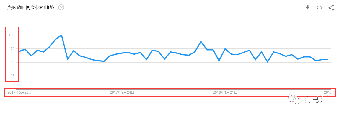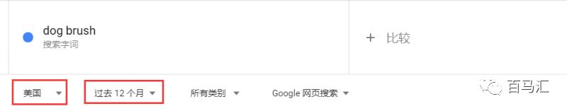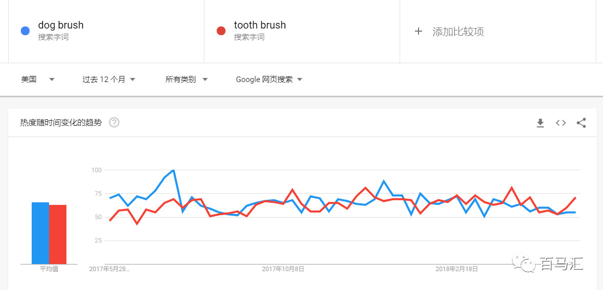 我們以dog brush為例搜索,得到下圖,最下方式時(shí)間軸,數(shù)字代表相對于圖表中指定區(qū)域和指定時(shí)間內(nèi)最高點(diǎn)的搜索熱度。熱度最高的字詞得 100 分;熱度是前者一半的字詞得 50 分;沒有足夠數(shù)據(jù)的字詞得 0 分。