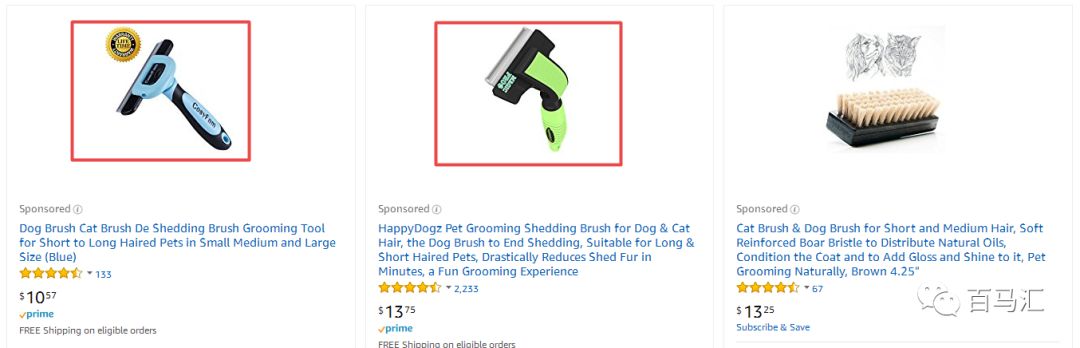 第二個,讓消費者點擊,這主要與產(chǎn)品的主圖有關(guān),以寵物刷為例,在亞馬遜前臺搜索可以看到以下頁面,第一個產(chǎn)品的主圖會比第二個產(chǎn)品的主圖更能引起大家點擊的欲望,因為差異性會讓消費者第一眼看到你,所以做主圖的一個小技巧就是:圖片上你有,但是其他賣家沒有的東西。