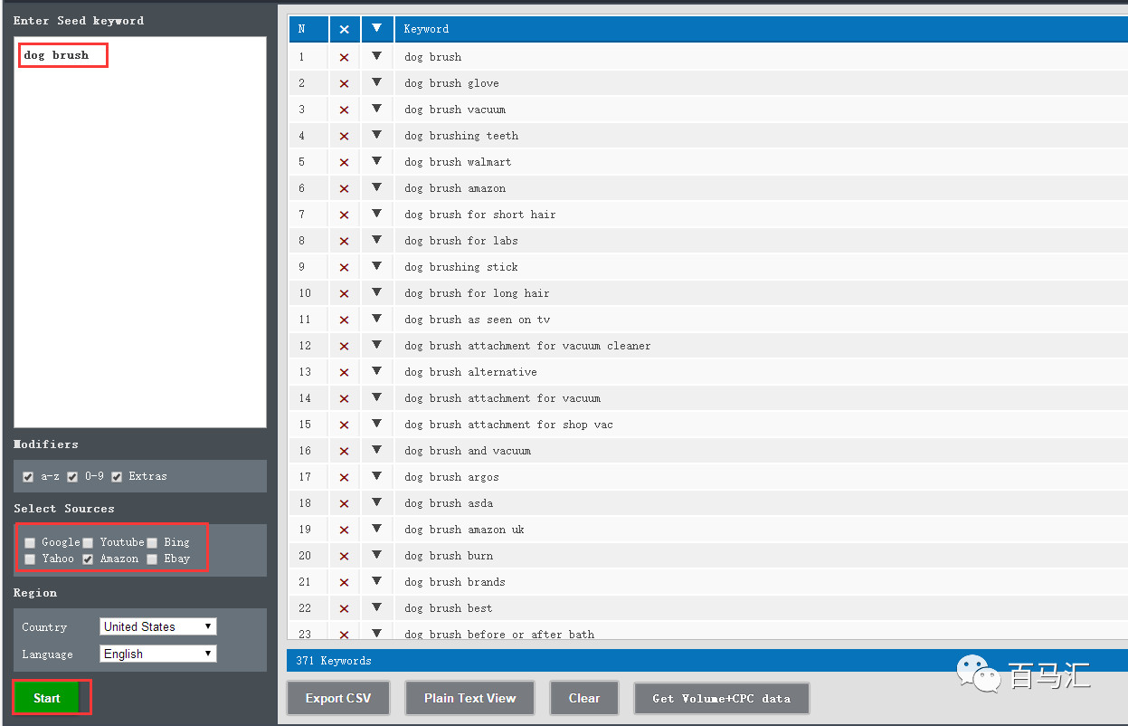 ③ 輸入關鍵詞,選擇Amazon,點擊start
