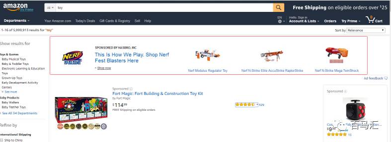 最近,亞馬遜平臺對seller賬號的賣家開放了廣告的黃金地段,即本月初上線賣家后臺上線的Headline Search Ads(標(biāo)題搜索廣告),在此之前,此廣告功能只提供給VE、VC賬號,如下圖所示,這種廣告展示能夠幫助產(chǎn)品吸引更多的消費者。