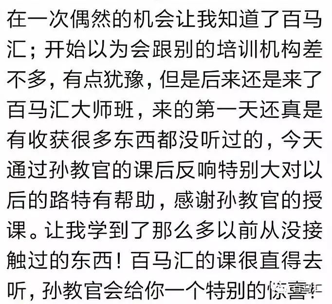 在一次偶然的機(jī)會(huì),他在網(wǎng)上搜到了百馬匯,于是試著去觀看孫教官之前直播的視頻,還參加了線下的公開課,感覺自己受益匪淺。