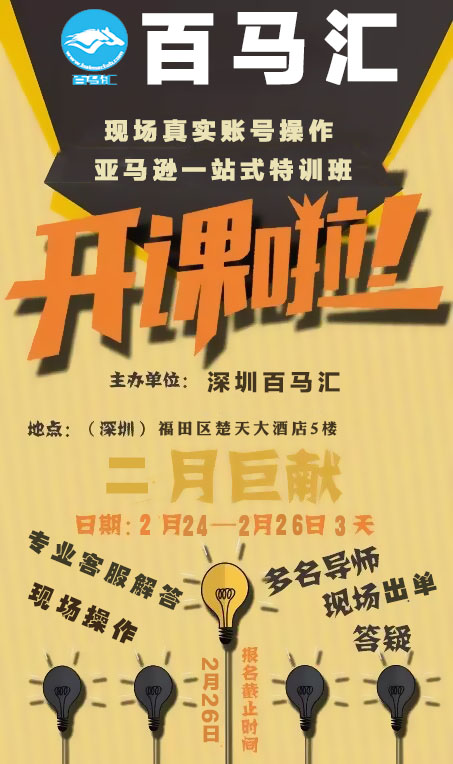 百馬匯主辦的新年第十四期【亞馬遜特訓(xùn)營】課程于2月24-26日開課啦!凡是經(jīng)朋友介紹或者帶一朋友來培訓(xùn)的一律9折優(yōu)惠哦!!