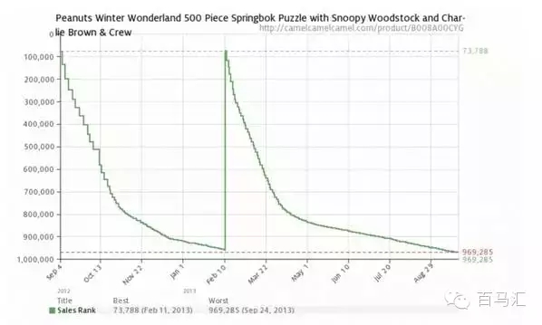 如果沒有銷售,Sales Rank會緩慢下降,直到有產(chǎn)品銷售出去,Sales Rank直接回到原來位置,并再次下降。大家可能注意到:下降的斜率也不是恒定的。