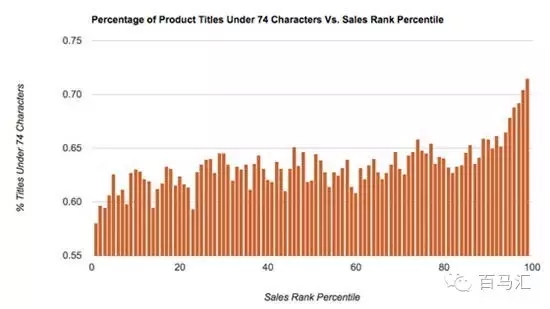如下圖所示,簡短的標(biāo)題和sales rank有很強(qiáng)的關(guān)聯(lián)性,即產(chǎn)品標(biāo)題字符在74個(gè)以下銷路更好。