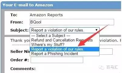 賣家要到http://www.amazon.com/gp/help/reports/contact-us 跟亞馬遜 Seller Performance Team 來聯(lián)系!確保你選擇 " Report a violation of our rules”