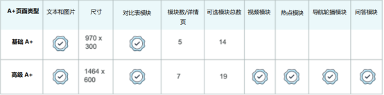 從以上的圖片中可以看出,高級A+頁面和基礎A+頁面都有文本和圖片以及對比表的模塊,而在圖片尺寸,可選模塊數(shù)量和詳情頁模塊數(shù)量方面都做了升級,最大的變化在于高級A+模塊增加了4種能夠更加專業(yè)展示產(chǎn)品的模塊。