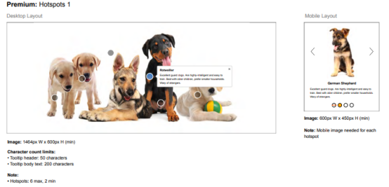熱點模塊可以在圖片的不同區(qū)域添加描述性的文字,共有2個模塊,每張圖片最多可以添加6個熱點,這個模塊特別適合展示產(chǎn)品的功能,優(yōu)勢和產(chǎn)品的使用方法。
