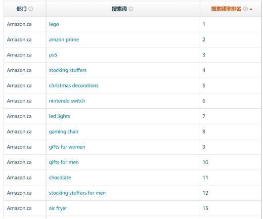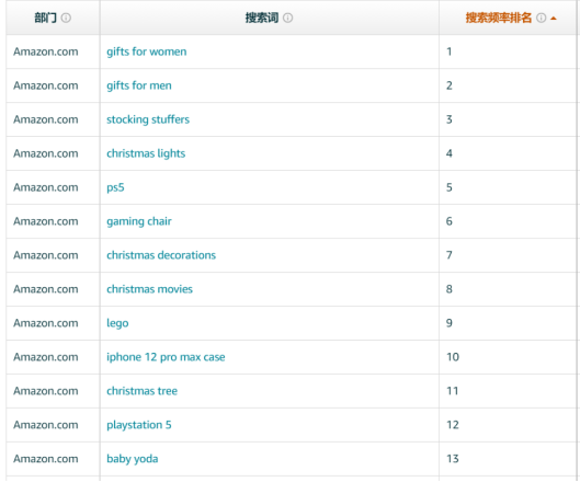 從往年的不同站點(diǎn)的搜索詞數(shù)據(jù)來(lái)看,可以看到,兩同站點(diǎn)排名有所不同的,但是 Gifts 和 Christmas相關(guān)的詞都是排名前列的。所以我們?cè)谧鰪V告的時(shí)候,完全可以用這個(gè)方面的詞,或者它們的長(zhǎng)尾詞。