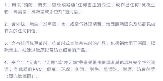 另外,Anti-Mites(防蟲螨),Inhibit-Algae(抗藻),Anti-Bacteria(殺菌), Stop-Microbe/Mildew(防霉/防菌), Destroy Fungal/Fungus(殺菌), Repal-Pesticides(防蟲), Anti-fouling(去污), Anti-fungal(抗真菌), Sanitize-Blight(防病毒), Sterilize(消毒),這些詞也容易被誤判為敏感詞。
