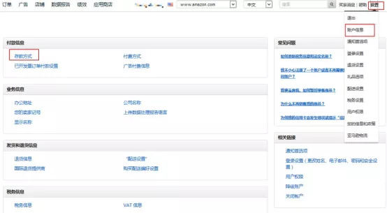 5、再回到亞馬遜后臺(tái),點(diǎn)擊右上角“設(shè)置-賬戶信息-存款方式”