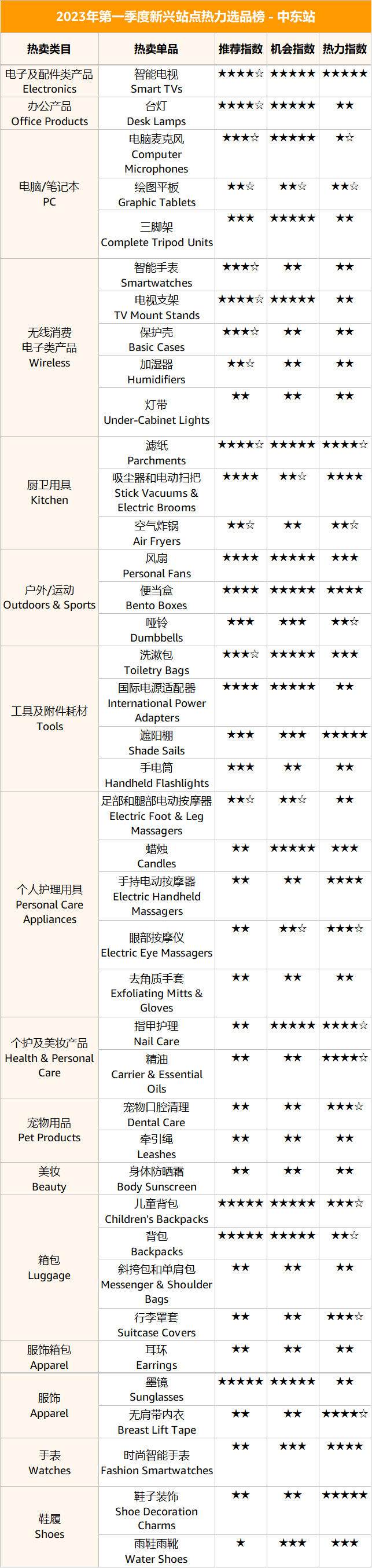 產(chǎn)品喜好:對比2022年下半年選品榜單,無線消費電子和工具附件耗材依舊是主流。對比2022年,2023年中東站尤其值得關(guān)注戶外運動、個人護理用具和箱包系列,需求度有明顯增加??梢钥闯?,中東站消費者愈發(fā)關(guān)注生活品質(zhì),注重儀容儀表。