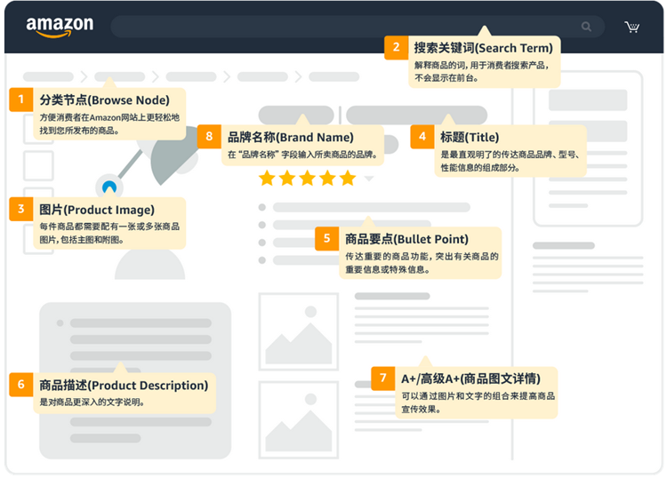 其中包含了八大要素:分類節(jié)點、關(guān)鍵詞、商品描述、A+頁面、品牌名稱、圖片、標(biāo)題、商品要點。