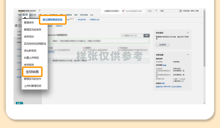 1、我們進(jìn)入賣家后臺(tái)的“庫(kù)存”下拉菜單中,選擇[全球銷售],點(diǎn)擊[建立國(guó)際商品信息],然后點(diǎn)擊[開始使用]