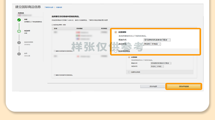 2、選擇來(lái)源商城和目標(biāo)商城,然后點(diǎn)擊[保存并繼續(xù)]