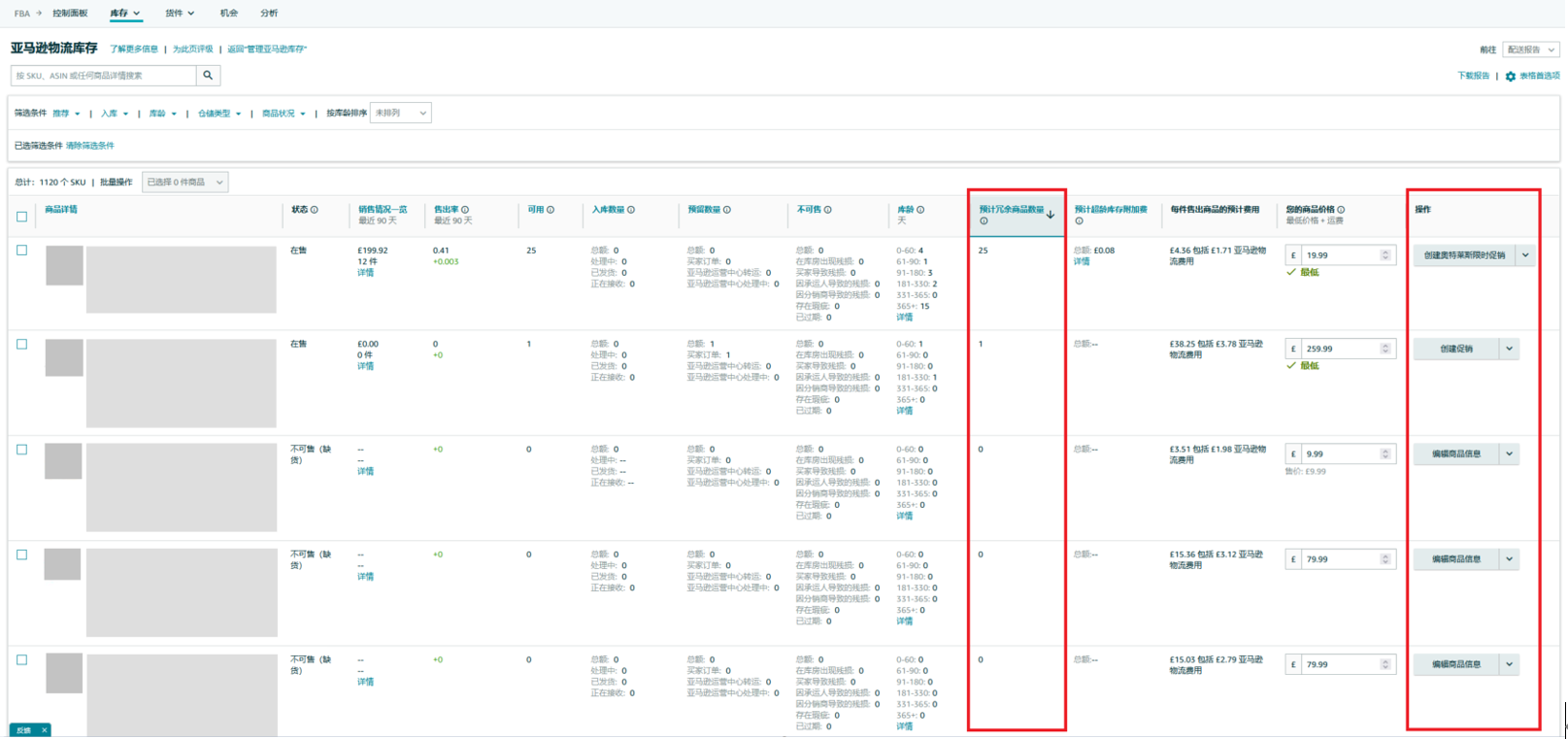 另外,在“亞馬遜物流庫存”工具中,可以對“預(yù)計(jì)冗余商品數(shù)量”進(jìn)行排序,從而篩選出冗余庫存。并且在右側(cè)“操作”中,亞?遜物流庫存工具會針對賣家的每個ASIN 提出建議,您可以結(jié)合自身產(chǎn)品市場、業(yè)務(wù)情況,選擇是否采納建議。