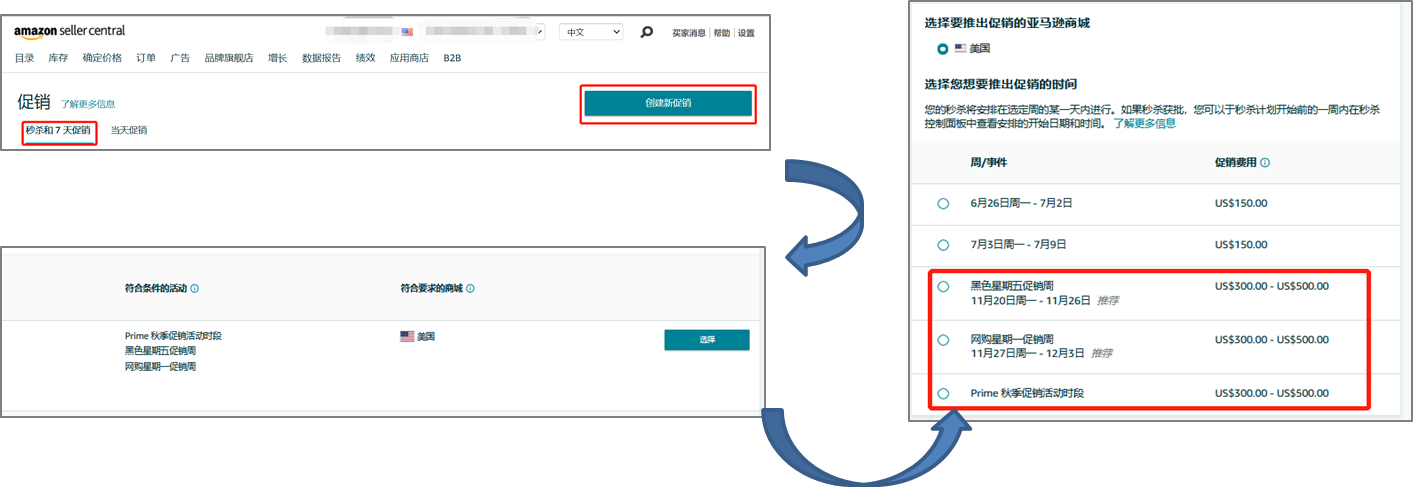 無(wú)論是平時(shí)還是旺季大促,Deal促銷(xiāo)推薦是由系統(tǒng)根據(jù)ASIN的表現(xiàn)進(jìn)行自動(dòng)推薦的,賣(mài)家可以在賣(mài)家平臺(tái)(路徑:賣(mài)家平臺(tái)-> 廣告 -> 秒殺 -> 創(chuàng)建新促銷(xiāo))查看自己是否有ASIN被推薦。
