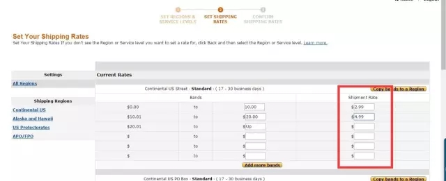 2.設(shè)置價(jià)格區(qū)間以及所收取的運(yùn)費(fèi),點(diǎn)選“Add more band”為添加收費(fèi)區(qū)間