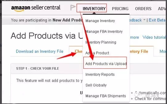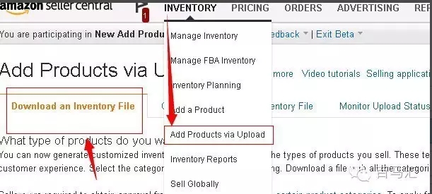 在Manage Inventory庫存管理頁面找到想要合并父子變體的商品,復制父子商品的SKU、ASIN信息,通過Inventory庫存——Add Products via Upload批量上傳商品——Download Template,下載該產(chǎn)品所在類目對應的批量模板。