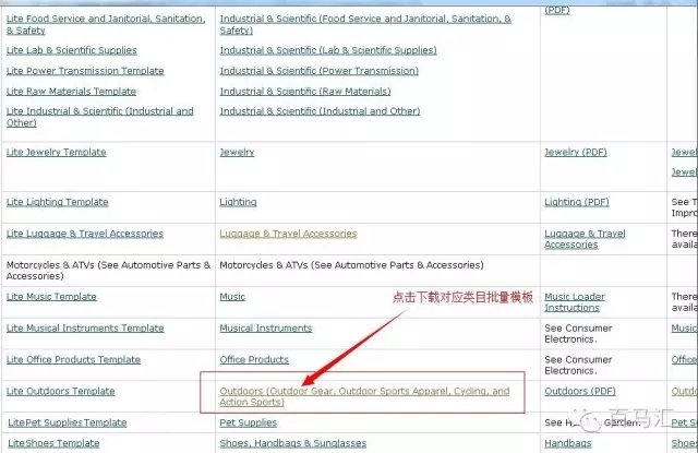 在Manage Inventory頁面找到要拆分變體的父子商品,復制他們的SKU、ASIN碼等信息,通過Inventory庫存——Add Products via Upload批量上傳商品——Download Template下載模板,下載與其所在類目相對應的批量模板。以outdoors模板為例,如圖所示: