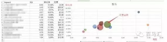 通過(guò)上圖,我們可以最直觀的看到最右邊的2個(gè)圓圈,ROI和轉(zhuǎn)化率都高,花費(fèi)又少,這2個(gè)詞語(yǔ)需要大力的投入,吸引更多的流量。再看最左邊的3個(gè)關(guān)鍵詞表現(xiàn),轉(zhuǎn)化率低,投資回報(bào)率也低,經(jīng)管花費(fèi)少,但是也需要考慮精簡(jiǎn)。中間的圓圈,綜合考慮你要流量,轉(zhuǎn)化率還是ROI,做個(gè)取舍。這個(gè)氣泡圖的作用就是最簡(jiǎn)單,最直接快速地協(xié)助你做出決策,篩選關(guān)鍵詞。