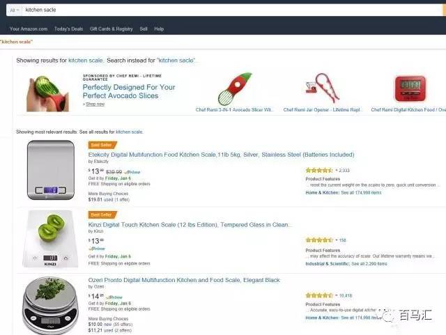 一、我們通過主核心關(guān)鍵詞搜索商品在amazon上的排序,在搜索框中搜索kitchen scale。歸納這些賣家在Bullet Point上賣點,如下圖紅色方框處: