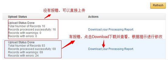 10. 最后我們點(diǎn)擊查看我們的問件上傳進(jìn)度以及完成程度,如圖所示的紅框中會(huì)顯示失敗的和已經(jīng)完成的產(chǎn)品信息。有問題的產(chǎn)品我們可以點(diǎn)擊Download查看我們上傳的產(chǎn)品信息有什么問題我們好更正,修改完成后在保存為文本格式,再重新檢查,并上傳。