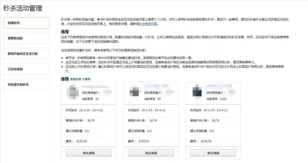 進(jìn)入秒殺管理界面后,可以自行創(chuàng)建被推薦listing的秒殺,如下圖任意點(diǎn)擊被推薦的產(chǎn)品“高級編輯界面”