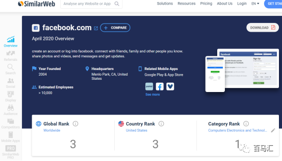 用Facebook在similarweb 搜索,我們會看到Facebook在全球排行第三,在Computers Electronics and Technology類目排名第一。