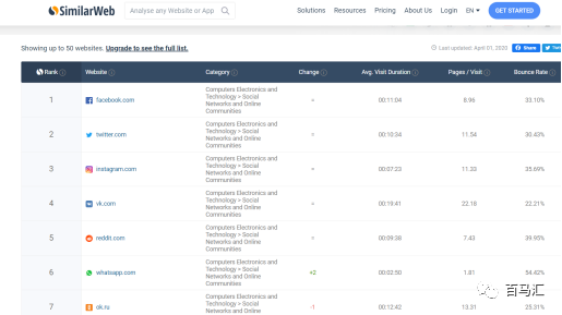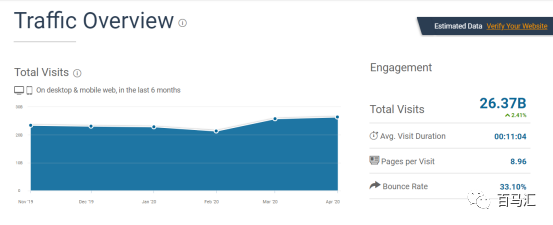 回到Facebook的similarweb分析頁面,下面還有流量匯總分析,F(xiàn)acebook四月份的流量高達26.37B,左邊的圖標可以看到前幾個月的流量情況。因此,從此處我們可以看出我們要推廣的站外網(wǎng)址,或者紅人博客的流量情況。