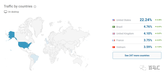 再往下similarweb還給我們分析了流量分布情況,從圖片可以看出,F(xiàn)acebook在美國的流量是最大的,占所有流量的22.24%。那么由此我們可以看出當我們分析某個deal或者折扣網(wǎng)站 或者紅人博客的時候,我們可以從這里看出該網(wǎng)址流量是否跟我們產(chǎn)品銷售站點匹配。如果這里的流量來源美國占絕大部分,而我們推廣的產(chǎn)品站點也是美國,那么就很符合了,否則就不符合。