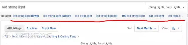 通過搜索框可以看到與你產(chǎn)品相關(guān)的一些買家會(huì)搜索的關(guān)鍵詞,由于這兩個(gè)詞的范圍比較廣,你可以根據(jù)你產(chǎn)品的特點(diǎn)縮小搜索范圍,現(xiàn)在以繩燈為例,就可以搜出如下結(jié)果: