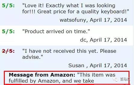 4.由FBA引起的物流問題,亞馬遜不會幫你將差評移除,但是會幫你劃掉差評,然寫一行字: This item was fulfilled by Amazon, and we take responsibility for this fulfillment experience.