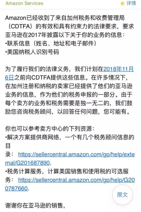 亞馬遜已經(jīng)收到加利福尼亞州稅務(wù)和稅務(wù)管理局(CDTFA)的一項(xiàng)有效和有約束力的法律要求,而亞馬遜方面為了履行在該法律下的義務(wù),計(jì)劃在2018年11月6日之前向CDTFA提供其平臺(tái)賣(mài)家在2017年披露的有關(guān)業(yè)務(wù)信息。
