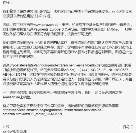 郵件稱:賣家不符合德國增值稅要求、賣家賬號被凍結(jié)、FBA庫存30天后無法刪除、無法通過歐洲其他國家運送物品到德國