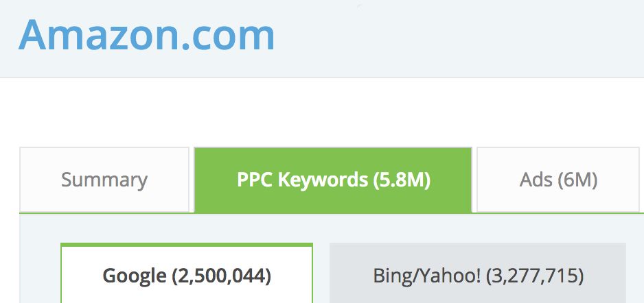亞馬遜在 Google AdWords(谷歌廣告服務(wù))、Bing(必應(yīng))和 Yahoo(雅虎)上投放了超過 580 萬個(gè)按點(diǎn)擊付費(fèi)廣告(pay-per-click)的關(guān)鍵詞,投放廣告數(shù)量超過 600 萬個(gè)。