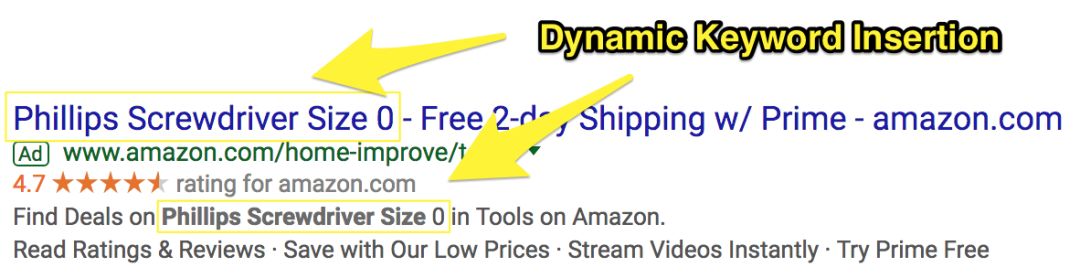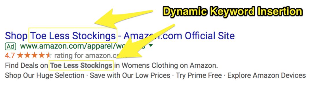 為此亞馬遜應(yīng)用「動(dòng)態(tài)關(guān)鍵詞插入 (Dynamic Keyword Insertion,DKI)」技術(shù),讓你正在搜索的關(guān)鍵詞根據(jù)預(yù)置的廣告模板,自動(dòng)出現(xiàn)在廣告的標(biāo)題和描述里。