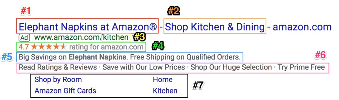 本段核心提煉:要在 AdWords 上勝過你的競爭對(duì)手,可以使用 ①動(dòng)態(tài)關(guān)鍵字插入 ②獨(dú)特的賣點(diǎn) ③與每個(gè)關(guān)鍵字匹配的著陸頁面 來設(shè)置具有針對(duì)性的廣告。Amazon 使用模板化的標(biāo)題和描述、動(dòng)態(tài)關(guān)鍵字插入和動(dòng)態(tài)生成的著陸頁,將用戶引導(dǎo)到按關(guān)鍵詞的相關(guān)性程度排序的產(chǎn)品頁面。
