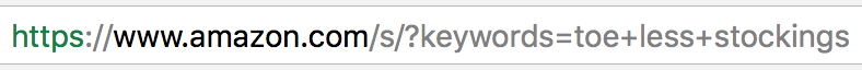 下圖就是網(wǎng)址最后呈現(xiàn)的樣子, 如果你在 Google 搜索「露趾絲襪」,然后點(diǎn)擊亞馬遜在 Google 投放的廣告,就會(huì)看到——亞馬遜動(dòng)態(tài)把搜索詞追加到了 URL 末端: