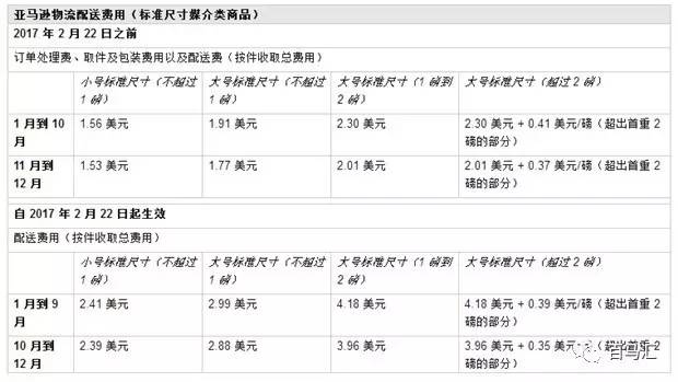 自 2017 年 2 月 22 日起,美國亞馬遜物流的訂單處理費、取件及包裝費用以及配送費將合并為單獨的配送費用(按件收?。?。此外,媒介類商品的配送費用將提高至與非媒介類商品的配送費用相同,并且媒介類商品和非媒介類商品將合并為一個標(biāo)準(zhǔn)尺寸分段。