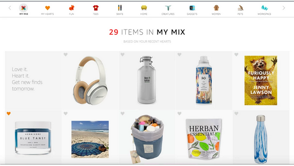 Interesting Finds是亞馬遜去年推出的一個頁面,類似于一個商店,用戶可以在這里發(fā)現(xiàn)亞馬遜全網(wǎng)站中好玩的產(chǎn)品,它的前身是“Amazon Stream”, 亞馬遜想把這個頁面打造成人們發(fā)現(xiàn)新奇產(chǎn)品的地方,從而刺激消費(fèi)。 如果消費(fèi)者在這個頁面上發(fā)現(xiàn)了自己喜歡的產(chǎn)品,可以在產(chǎn)品左上角點(diǎn)擊“喜歡”(紅心),這樣用戶喜歡的產(chǎn)品就會出現(xiàn)在“My hearts”欄目中。