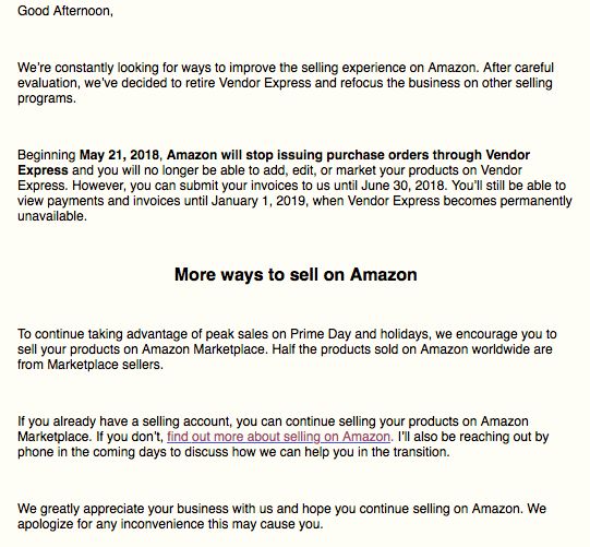 昨日,部分賣(mài)家稱(chēng)收到了亞馬遜郵件,郵件顯示將關(guān)閉Vendor Express項(xiàng)目,該項(xiàng)目預(yù)計(jì)將于5月21日停止接收訂單,并于2019年1月1日起永久停用。