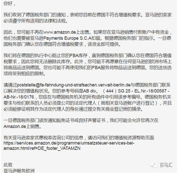 并且賣家賬戶中所剩余的資金和庫(kù)存也將一并被凍結(jié),直至賣家獲得德國(guó)稅局頒發(fā)的豁免證書或良好聲譽(yù)證書,對(duì)于中國(guó)賣家而言,主要提供的就是VAT證書。
